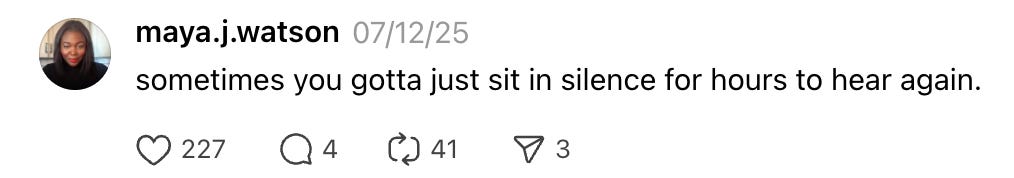 Distraction is profitable. The less connected we are to our own thoughts, the easier it is for other people to tell us who to be, what to want, and how to measure our life. That’s why the noise never stops. More scrolling, new algorithms, endless alerts, more jarring headlines and opinions. 24/7 noise. The goal isn’t just to capture our attention. It’s to keep us from ever sitting with ourselves long enough to hear what’s true.