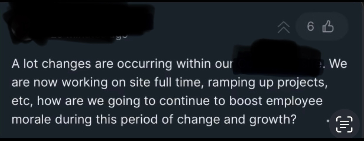 Our site head took great offense to it. He said “I am shocked at this question” and proceeded to say that “we have a big screen tv, a basketball court, tennis court, a grill etc. this morale thing goes both ways but if you’re not happy being here I understand if people leave.” I didn’t think I worded it offensively. They don’t affirm us in any way. They say our numbers are great, we’re surpassing benchmarks, now do it again with no incentives and less money AND they don’t allow us to ask questions anonymously. Was I out of line or could I have worded it differently???